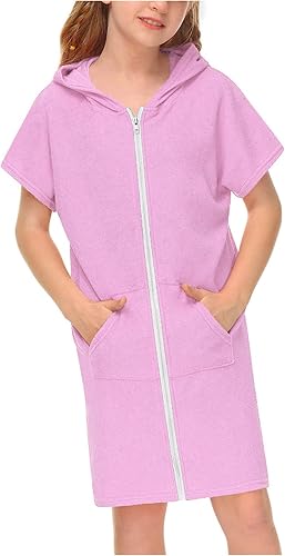 Girls Swim Terry Cloth Cover Ups Kids Swimsuit Coverup Zip-Up Beach Bathing Suit Wraps Summer Short Sleeve Beach Dress(A-pink,10-11 Years)