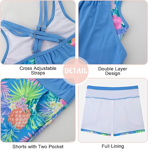 Tankini Design: The tween girls swimsuits have a stylish pleated neckline and adjustable cross-strap design. The shorts have pockets for carrying small items. Sexy yet not revealing design, allowing your little girl to move freely and enjoy her time in the water without feeling any discomfort.