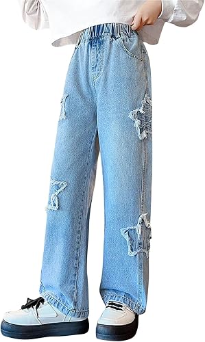 Material: Crafted from a comfortable cotton blend denim with generous stretch, these wide leg jeans offer flexibility and ease of movement. The soft yet durable fabric ensures all-day comfort for active kids, making these pants a wardrobe staple. girls wide leg jeans size 10-12 years.
