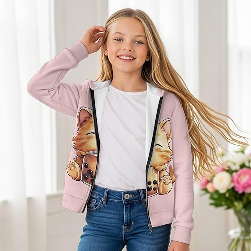 Girls Zip Up Hoodies Jackets Kids Fall Long Sleeve Sweatshirts Outerwear with Pockets 6-16 Years(Milk Cat,11-13 Years)