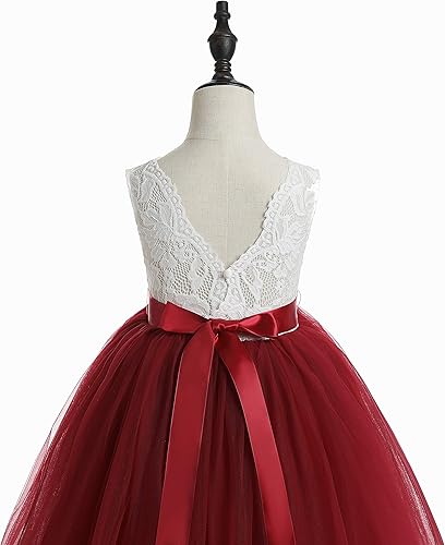 Design: Emerald Green + Ivory sleeveless girl dress. Our enchanting ankle length flower girl dress, is made with a delicate white lace bodice and several choices fully lined, tulle colors for the skirting. The V shaped back lace adds the perfect amount of boho chic look to this amazing dress. The lace has an elegant, almost paisley design and is perfectly matched with one of our gorgeous jeweled sashes and simple satin bow. Girls lace bridesmaid dresses long wedding guest, girls formal dress