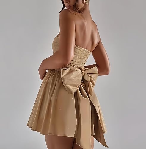 Features: Glitter Tulle short homecoming dress 2025 with bow, strapless, A Line, puffy, glitter tulle, bow back, sleeveless, corset, backless, above knee length, mini, lace up back, built in bra, strapless homecoming dresses for teens 2025, sparky short prom dress with bow, a line mini hoco dress for women, gold mini dress, bow mini dress, sexy backless dama dresses, light pink short quinceanera dresses.
