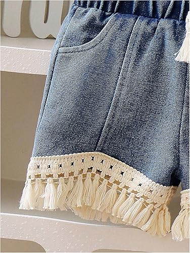 Features: 2 piece clothing sets for girls, round neck sleeveless tank tops, elastic waist jean shorts, with tassels decor