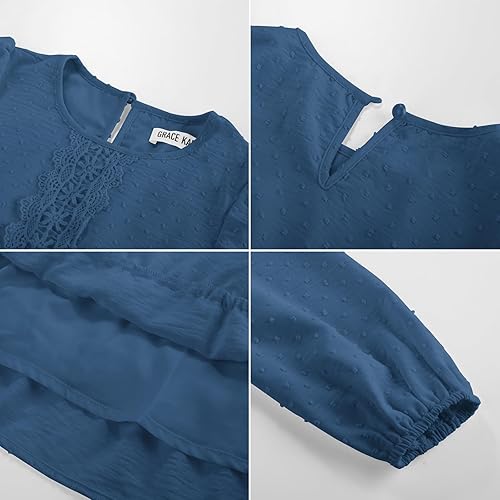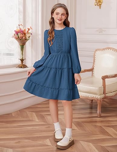 Features: Girls fall dress with solid color features long lantern sleeves, loose tiered ruffled hem, lace trim at center chest, crew neck, A-Line, back keyhole, lined, combining trendy style with comfort. The unique design adds a touch of sophistication, perfect for young fashionistas