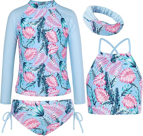 Stylish Design Points:The 4piece swimsuit consists of a printed long-sleeved top and a strap tankini set,the matching headband complements the set,which are not only cute but also offer sun protection.Whether splashing in the waves or building sandcastles,your little one will feel confident and happy.