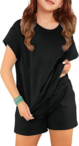 Girls 2 Piece Outfit: Short sleeve, crew neck, solid color t shirt; Loose fit shorts, drawstring elastic waistband elastic waistband, easy to wear and give a simple and energetic look.