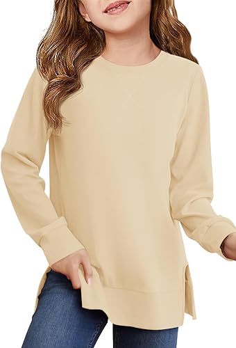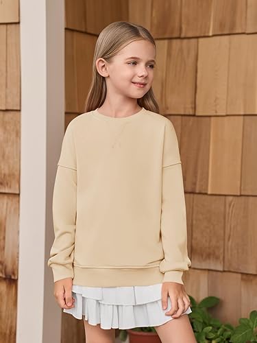Design: Crew neck pullover sweatshirts for girls, loose long sleeve tops, fleece lined, ribbed cuffs, solid color, relaxed fit, slight stretch, fall outfits for teens, fashion and casual style