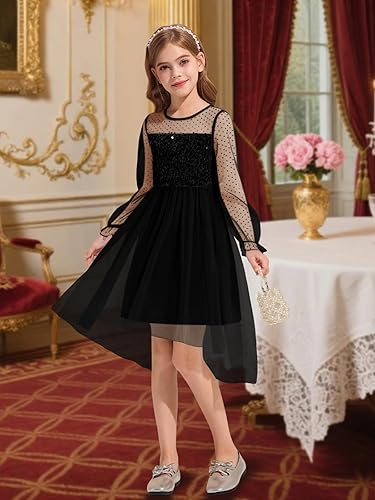 Elegant Design for Little Princess: This high waist A-Line princess dress features a front mesh design paired with charming puffy mesh sleeves, creating a stunning and eye-catching look. The multi-layered tulle skirt with a high-low hem adds a touch of whimsy, making your little one feel like a fairy-tale princess