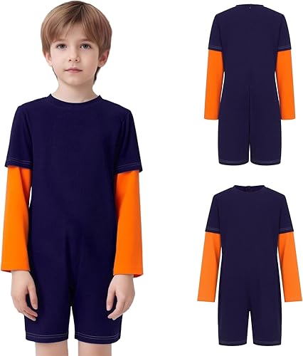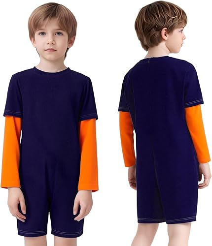Hansber Special Needs Adaptive Clothing for Children Long Sleeve Short Leg Zip Back Jumpsuit Autism Sensory Romper Navy Blue Orange 8 Years