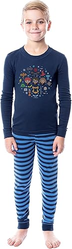 CLASSIC DESIGN - These tight-fit pajamas feature the Golden Trio (Harry Potter, Ron, and Hermione) in a fun mock sweater style surrounded by several s from the series.