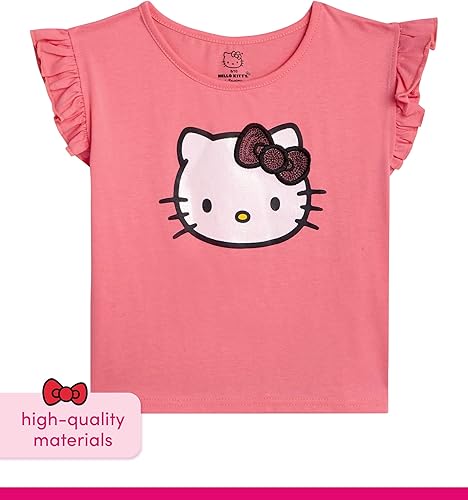 Soft Graphic Tee: Your girl will love the comfy feel of this short-sleeve Hello Kitty outfit featuring a fun, colorful graphic of her favorite character. Designed with a slight ruffle on the sleeves and another with classic graphic crewneck top, this lightweight tee is soft against her skin and easy to wear all day-whether she's off to school, a party, or just having fun at home.