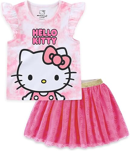 Contains a soft, pink tie dye shirt with a playful Hello Kitty print, and a matching pink tulle skirt adds a layer of fun, with delicate flocking that makes every twirl extra special, making your little girl feel like a true star.