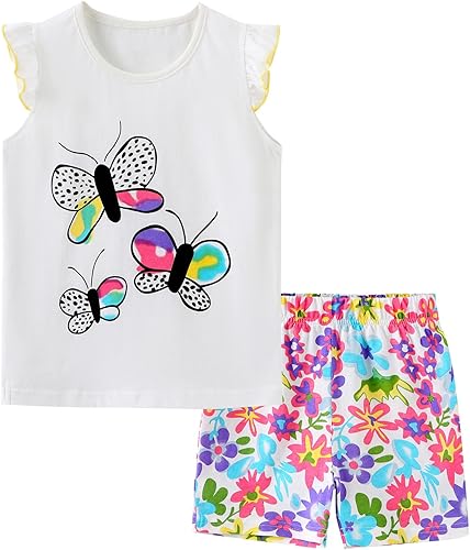 HILEELANG Girl Short Sets Summer Short Sleeve White Buffterfly Floral Shorts Cotton Casual Playwear Outfits Clothing Sets Size 7