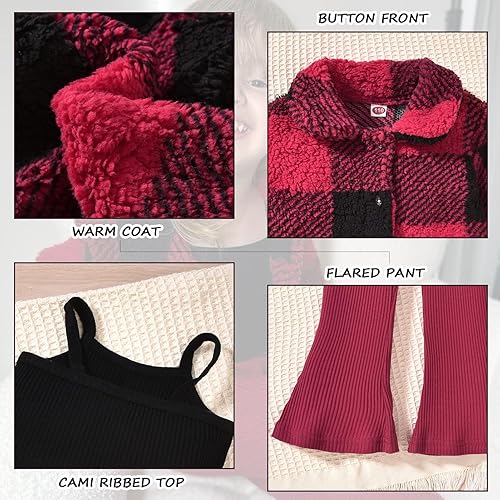 Unique Design: Super cute toddler little girl fall winter clothes set, solid cami top, bell bottom flare pants, matching with the buffalo plaid coat for complete fall outfits. Your little lover will get a lot of compliments when she's in this set