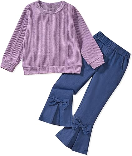 Sweetness And Trendy Design: The solid color long sleeve sweatshirt top with bell bottom flare jeans, adding a playful and unique touch to the outfit. Making your baby girl stand out from the crowd