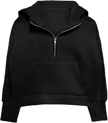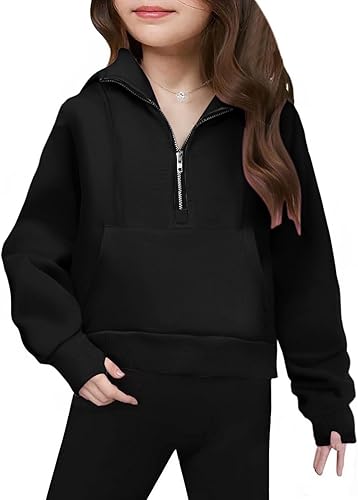 Hoodies For Teen Girls Half Zip Up Tops Solid Casual Pullover Tops Long Sleeve Fall Winter Soft Active Sweatshirt(Am01-black,11-12 Years)