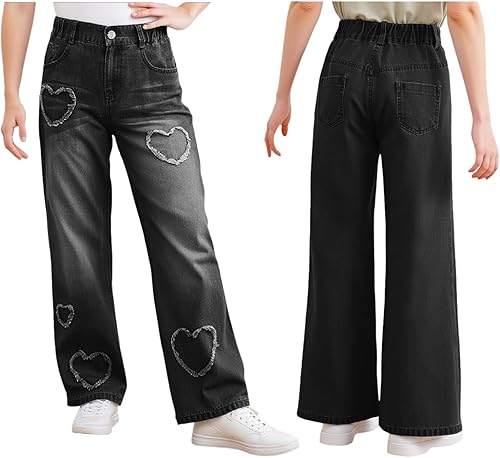Hularka Kids Girls Jeans Elastic Waist Retro Style Y2K Heart Patchwork Denim Pants Washed Denim Trousers Streetwear(Black,10 Years)