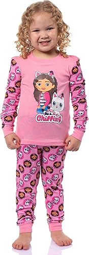 Charming Design - This pajama set features a colorful graphic of Gabby and Pandy Paws with the text "Chilling" on the front of the long-sleeve shirt, with matching character portraits throughout the sleeves and pants