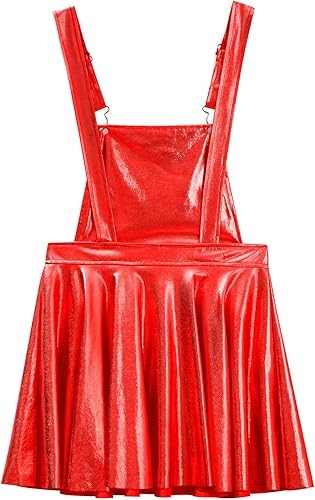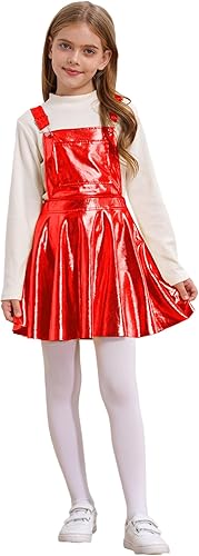 JanJean Kids Girls Metallic Overall Dress Adjustable Suspender Skirt Stretchy Pleated Jumper Dress for 70s Disco Party(Red,16 Years)