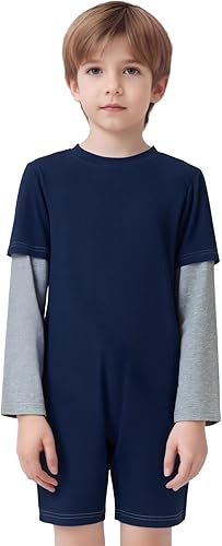 JEATHA Zip Back Long Sleeve Color Block Short Leg Jumpsuit Adaptive Clothing for Kids with Special Needs Navy Blue Gray 8 Years
