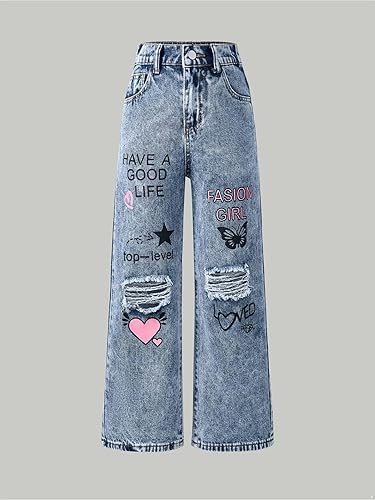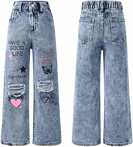 The ripped design on the jeans is a popular style, giving a cool and edgy look that is both fashionable and youthful