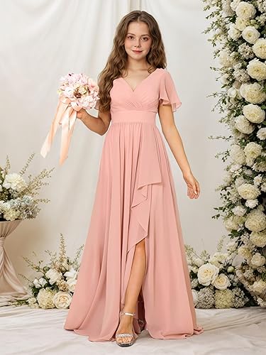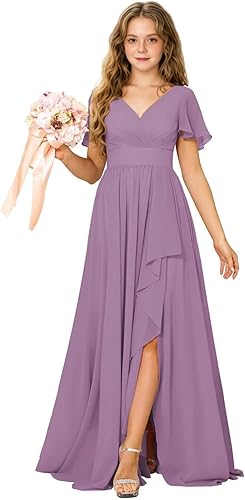 Features: Junior Bridesmaid Dresses for Girls, A-Line, Flower Girl Maxi Chiffon Dress, V-Neck, High Low, Ruffles Sleeve, Floor Length, Zipper Back, High Waist, Charming Princess Dresses.