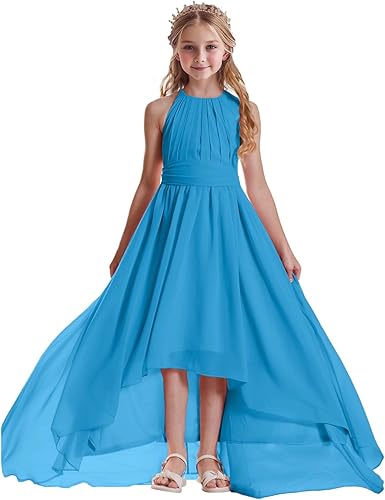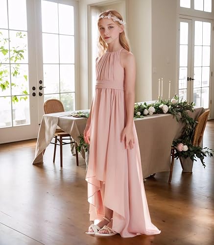 Junior Bridesmaid Dress Features: Our Chiffon Bridesmaid Dress is featuring halter design and high low dress and A-line style, allowing for ease of movement and ensuring a comfortable fit. The chiffon belt allows for flexible waist adjustment and can be folded into a bow shape.