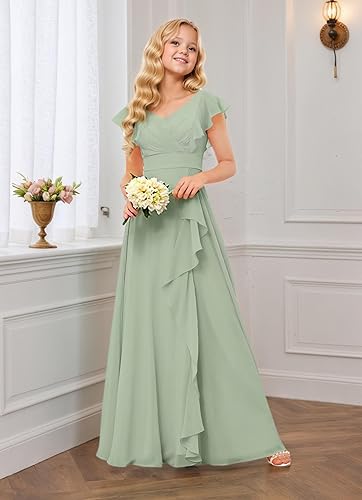 Flower girl dress features: elegant jr bridesmaid dress, flutter sleeves girls formal dress, side split pageant dress for teen girls, the flowing girls party dress will make your girl so gorgeous and eye catching, v back with zipper closure,tightly sewn and well made, make the prom dress stunning while be easy to fit. This formal dress will bring your girl a wonderful memory at her special moments!