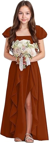 Design: This Wedding Party Pageant Gown Made of Soft chiffon,This girl's bridesmaid dress features a floor-length design with a graceful Square-neckline, Paired with ruffled short sleeves for a touch of cuteness, a natural waistline, and a zipper closure, creating a dynamic look as the girl walks