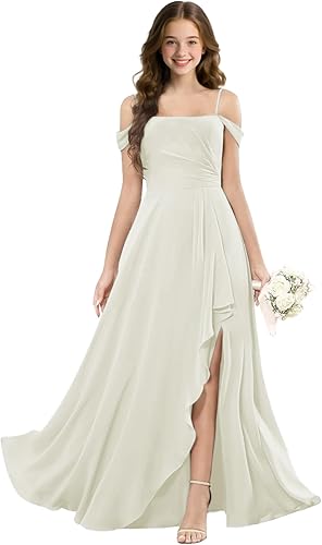 Exquisite design for little bridesmaid dress:A line floor length girls wedding dress,Strapless junior bridesmaid dresses,High-waisted design,Spaghetti straps girls prom bridesmaid dress,Lace Up Pleated Ruffle Chiffon Girls Formal Evening Gowns,Sleeveless flower girl dress,The jr bridesmaid dress has 2 layers,This prom dress for little girls can show the elegant figure of a girl