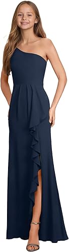 Features: Ruffle split junior bridesmaid dress, one shoulder girls prom bridesmaid dress,floor length chiffon flower girls dresses for wedding,A line,drawstring back,your little princess will be excited about this gorgeous chiffon dress.