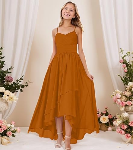 Feature:Junior Bridesmaid Dresses,Chiffon Flower Girls Dresses for Wedding,Chiffon Bridesmaid Dress for Juniors,Spaghetti Straps,V- Neck,Ruffles,Rruched,High-Low,A Line,Zipper Back design make this girls bridesmaid dress flattering and gorgeous.Perfect for little girls/teen girls/ junior girls/tween girls.