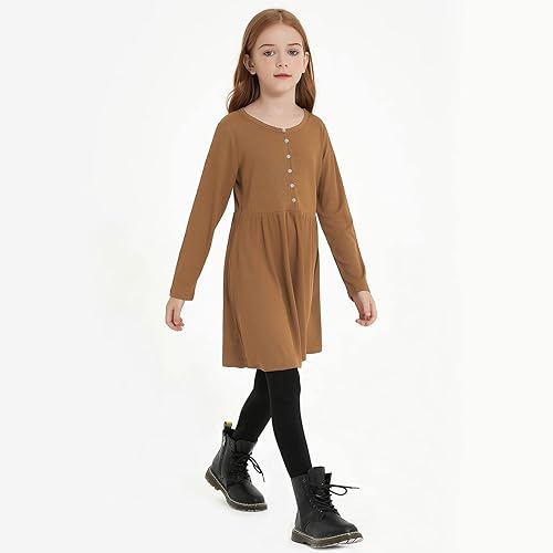 Brown dresses for girls, Ribbed cotton, Drop Shoulder, Long sleeves, Crew neck, Knee length