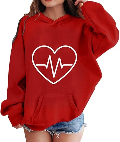 KAGAYD Cute Heart Hoodies for Teen Girls Valentine's Day Preppy Hooded Sweatshirts Oversized Long Sleeve Shirts(Red,12-18 Months)
