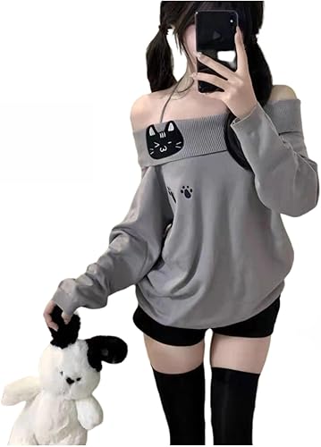 Japanese-inspired Kawaii Design: Featuring a off shoulder design, this harajuku sweatshirt in grey with cute cat and cat claw decor is perfect for creating a sweet and playful look that stands out