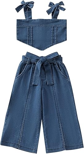 Design: girl cami crop tops bell bottom toddler summer outfit, kid girl sleeveless denim crop top with spaghetti strap, bow knot, matching a girl jeans pants with wide leg, elastic waist and pocket.