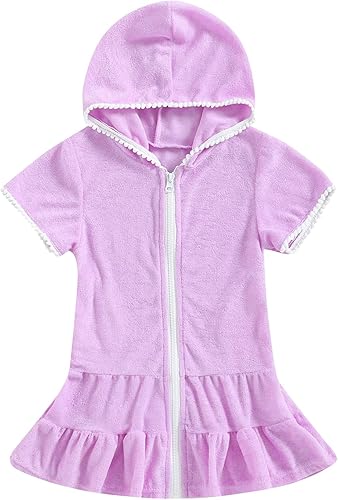 Feature:Girls swim cover up with hooded,girls cover up swim, girls swim cover up.Full frontzip up closure which is easy to pull on and take off.Ruffle hem and fringed cuff, cute beach terry swimsuit cover up ,toddler girl swim cover up with hood,little girls terry cloth swim beach cover up.User will get an extra protection from the sun,keep your girls' skin protected from UV damage.