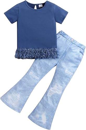 Kid Toddler Girl Summer Clothes Solid Color Short Sleeve T-Shirt Fringe Hem + Flared Leg Pants Outfits 6-7T