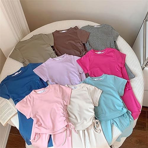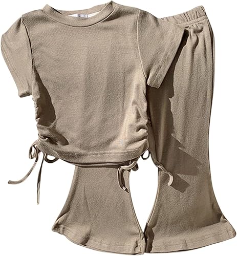 Kids 2 Piece Outfit Girls Plain Crop Ruched Knot Side Top Short Sleeve Flared Pants Y2K Streetwear Solid Casual Set(Green,12-18 Months)