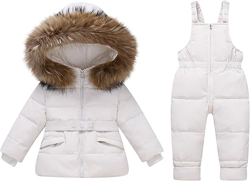 Kids 2 Piece Snowsuit Set Boys Girls Winter Warm Hooded Puffer Jacket & Snow Bib Pants Thickened Outdoor Ski Suits(02 White,1 Years)