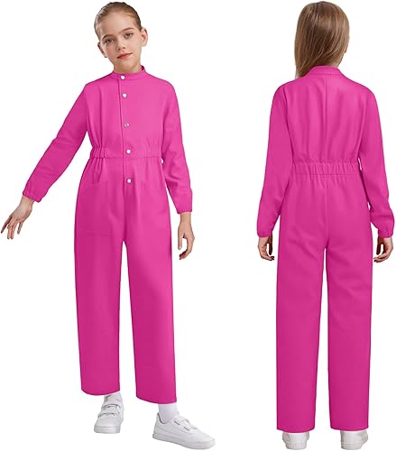 Kids Boys Girls Long Sleeve Mechanic Coveralls Flight Suit Jumpsuit Fancy Dress Up Casual Straight Leg Rompers Hot Pink 14 Years