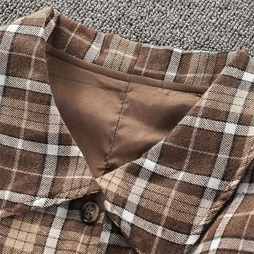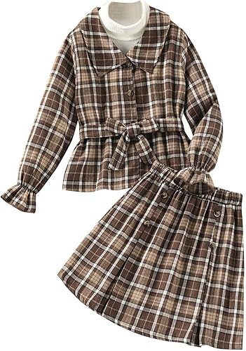 Kids Child Girls Long Ruffled Sleeve Fleece Suit Jacket Coat Tops Plaid Skirt Fall Winter Set 2PCS Outfits for 7~12T(Brown,8-9 Years)