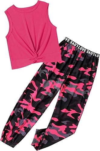 Stylish Design: This girls summer outfit from our range of clothes for girls features a twist-front top with a sleeveless cut and cropped length, offering a cute and trendy alternative to a basic T-shirt. The high-waisted camo pants with letter print elastic waistband, and cuffed ankles blend style and comfort perfectly