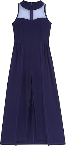 One-piece jumpsuit designs with halter neck, mesh spliced for showing collar bone, sleeveless, skinny pants with front open skirt, back zipper