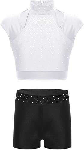 Girl's top is decorated with shiny rhinestones to brighten up any performance and create an eye-catching effect