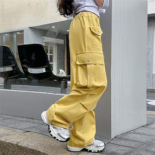 Kids Girls Baggy Cargo Pants Loose Wide Leg Straight Elastic Waist Trousers Solid Casual Streetwear with Pockets(Yellow,12-13 Years)
