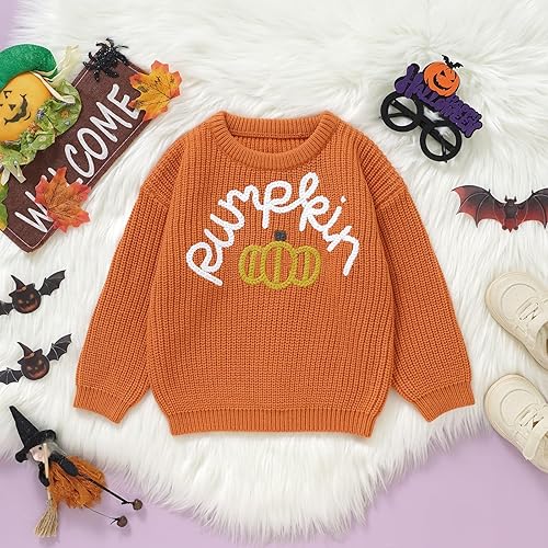 Feature: The kids pumpkin knitwear top with a loose fit and sized to the appropriate age; Long sleeve and crew neck sweater with stretch for comfort
