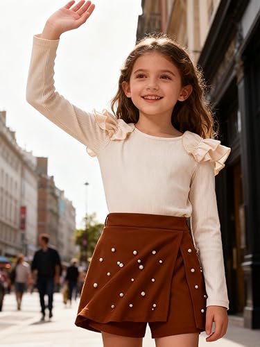 Features:Kids girls skirt set top with ruffled shoulder sleeves, fashionable and cute. And pearl embellishment on the front of the skirt, more fashionable, let your child wear it with more confidence and win more compliments