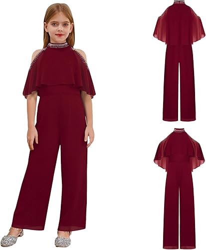 Kids Girls Cold Shoulder Sparkly Jumpsuit Romper One Piece Wide Leg Pants For Wedding Party Burgundy 14 Years