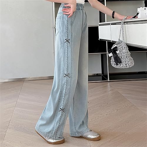 Kids Girls Cute Bowknot Straight Jeans Elastic High Waist Wide Leg Denim Pants Youth Girls Trendy Adorable Trousers(Blue,5-6 Years)